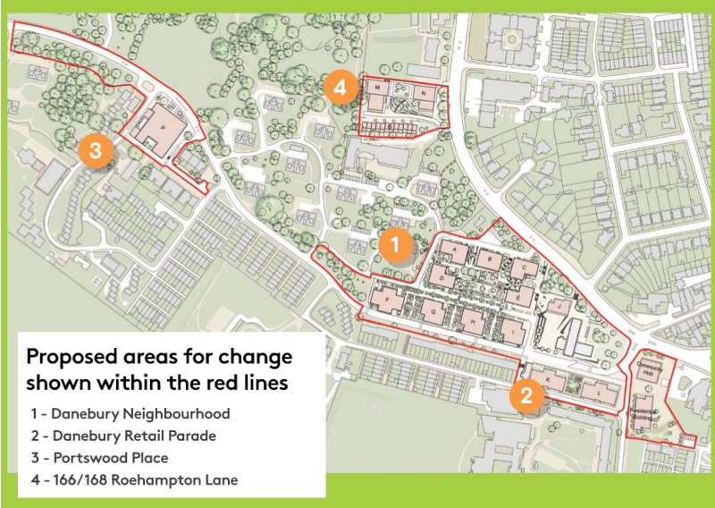 - New homes to replace the blocks on Harbridge Avenue, Kingsclere Close and the northern side of Danebury Avenue, all surrounding a new central green square